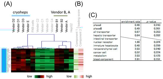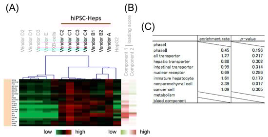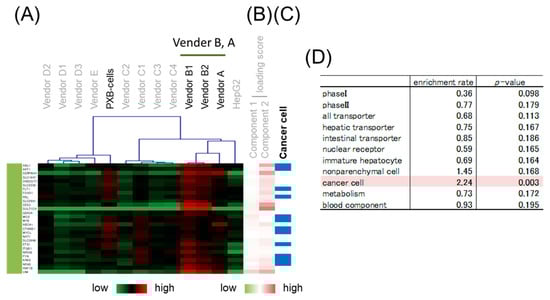 Hierarchical clustering was performed to classify genes whose expression patterns are similar. We selected branches collecting genes that tend to have the same loading score in PCA (Figure 4B,C). Among the samples, five branches were found to have expression levels that characteristically changed as shown by color. Enrichment analysis was performed to evaluate the characteristics of genes enriched in branches of each color. The genes on the focused microarray were classified as shown in Table S3, and the significance of the enrichment was evaluated through a chi-squared test. The level of significance was set at p < 0.01 and enrichment fold > 1.5. Genes with a high loading score for PC1 were included in an orange branch, and their expression levels were high in hiPSC-Heps and HepG2 cells. In this branch, non-parenchymal cell markers and immature hepatocyte markers were enriched by more than 1.5-fold, albeit nonsignificantly (Figure 5). Genes with a low loading score for PC1 were included in a yellow branch, and their expression levels were high in cryohepatocytes and PXB-cells. In this branch, genes related to drug metabolism phase I enzymes and hepatic transporters were significantly enriched (Figure 6). Additionally, 10 of the 11 genes related to transporters were hepatic transporters (Figure 6E). Genes with a high loading score for PC2 were included in a green branch, and their expression levels were high in PXB-cells and hiPSC-Heps from vendors A and B. In this branch, genes related to cancer cells were significantly enriched (Figure 7). Genes with a low loading score for PC2 were included in a purple branch, and their expression levels were high in hiPSC-Heps from vendor C. In this branch, genes related to drug metabolism phase II enzymes, intestinal transporters, and metabolism were significantly enriched (Figure 8). Additionally, 10 of the 12 genes related to transporters were intestinal transporters (Figure 8E). Genes with a low loading score for PC1 and a high loading score for PC2 were included in a blue branch, and their expression levels were high in cryohepatocytes, PXB-cells, and hiPSC-Heps from vendors A and B. In this branch, genes related to nuclear receptors, non-parenchymal cell markers, metabolism, and blood components were enriched by more than 1.5-fold, albeit nonsignificantly (Figure 9).
