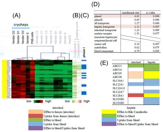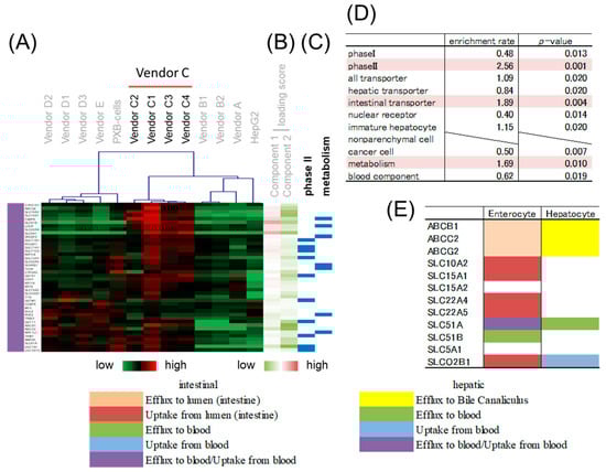 Enrichment analysis of the purple branch. (A) Heatmap patterns. (B) PC 1 and 2 scores. Red lines exhibit plus scores, and green lines exhibit minus scores. (C) The blue lines exhibit genes related to drug metabolism phase II enzymes. (D) Enrichment rates and p-values from the chi-squared test of different gene categories. The highlighted categories are significantly enriched. (E) Transporter genes. Hepatic and intestinal transporter genes are classified according to function, as shown by color.