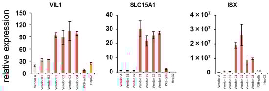 In the branch shown in Figure 8, genes related to intestinal transporters were significantly enriched, and their expression levels were high in hiPSC-Heps from vendor C. Additionally, the expression level of CYP1A1, known as the intestinal CYP1A, in these cells was much higher than that in other hepatocytes. These results suggested the possibility of finding the intestinal characteristics in hiPSC-Heps from vendor C. Therefore, the expression levels of VIL1, ISX, and SLC15A1, which are intestinal markers, were measured by qPCR [49]. The expression of any intestinal marker in hiPSC-Heps from vendor C was higher than that in other hepatocytes (Figure 10), suggesting the possibility of mixing the intestinal characteristics of enterocytes in them.