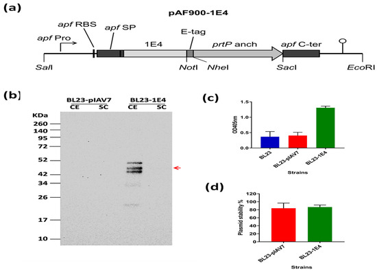 The display of VHH 1E4 on L. paracasei BL23 cell surfaces was confirmed through a fluid-based assay using a mouse monoclonal anti-E-tag primary antibody and an alkaline phosphatase-conjugated rabbit anti-mouse secondary antibody. Compared with the non-expressing L. paracasei strain, the VHH 1E4-expressing cells gave a strong signal, confirming the expression of VHH 1E4 on the surface of the Lactobacillus cells (Figure 1c). The plasmid stability and persistence of the recombinant L. paracasei BL23 strain expressing VHH 1E4 were measured through colony counts. For both the empty vector and the strain carrying the expression cassette, the proportion of plasmid-containing cells declined by 20% after approximately 6–8 h of culture in MRS broth (Figure 1d).