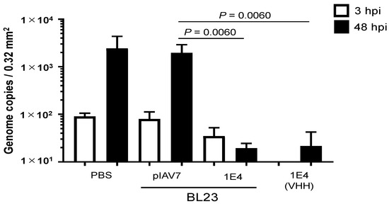 Neutralization of norovirus GII.17 in vitro by 1E4 nanobody-displaying Lactobacillus (BL23-IE4).We incubated 2 × 106 genome equivalents of GII.17 (Kawasaki 308) human norovirus with 3 × 106 cells of L. paracasei BL23-pIAV7 or BL23-1E4 or with 5 μg of recombinant VHH 1E4 for 2 h before using them to inoculate human intestinal epithelial cells. After inoculation, the cultures were incubated for 48 h in the presence of bile. Each data point is representative of at least three independent experiments, and data are shown as the mean ± 1 SD of six wells of supernatant from each culture group.
