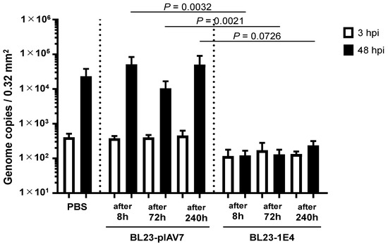 Next, we used human iPSC-derived IECs to test whether L. paracasei BL-23 cells expressing 1E4 VHH neutralized the propagation of human norovirus GII.17. Because of the prolonged culture time (48 h) needed for assessment of neutralization activity by the VHH 1E4-expressing recombinant L. paracasei BL23 strain, we changed the antibiotic treatment in the in vitro propagation assay using human iPSC-derived IECs to erythromycin instead of the penicillin–streptomycin originally described. GII.17 norovirus has the ability to survive in low pH (2% citric acid, pH 3–5) and replicates in iPSC-derived IECs [24]. Although the growth of L. paracasei BL23 pIAV7 (the negative control strain) might result in acidic pH in the cell culture, there was no pH-effect on GII.17 norovirus propagation in human iPSC-derived IEC in vitro when compared with that of PBS (Figure 2). Under these conditions, a dose of 3 × 106 L. paracasei BL23-1E4 cells neutralized 2 × 106 genome equivalents of norovirus GII.17 (Kawasaki 308); this dosage was equivalent to 5 μg of recombinant 1E4 (Figure 2).