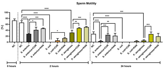 The effect of curcumin and kanamycin on rooster sperm motility (%) during induced bacterial contamination. p < 0.05 (*), p < 0.01 (**), p < 0.001 (***), p < 0.0001 (****). NC—negative control, CUR—curcumin, KAN—kanamycin.