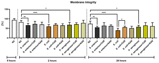A significant decrease in membrane integrity was observed after 2 and 24 h in all positive controls when compared with the negative control (p < 0.01 in the case of S. enterica; p < 0.0001 for E. coli; p < 0.05 for P. aeruginosa; Figure 2). While a slight improvement in membrane integrity was observed following CUR or KAN administration at 2 h, no significant differences were observed between the positive controls and experimental groups. After 24 h, a significant stabilization of sperm plasma membranes was observed only in the case of spermatozoa exposed to CUR in the presence of E. coli (p < 0.05).