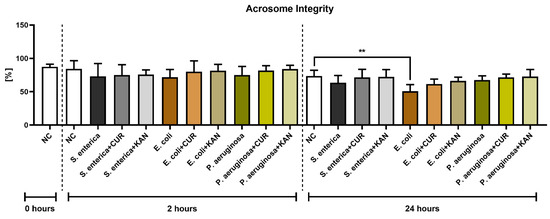 Following 24 h, a significantly decreased acrosome integrity was observed in the E. coli positive control in comparison with the negative control (p < 0.01). Neither CUR nor KAN were able to significantly stabilize the acrosomal structures against the detrimental effects of bacteria present in the respective co-cultures.