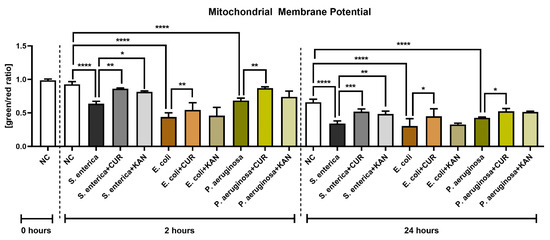 The presence of bacteria, particularly E. coli, led to a significant decrease in mitochondrial membrane potential as compared with the bacteria-free negative control after 2 h of co-culture (p < 0.0001; Figure 4). On the other hand, CUR supplementation in all relevant experimental groups led to a significant stabilization of the mitochondrial activity in comparison to their respective positive controls (p < 0.01). The presence of KAN led to a significant improvement only in the experimental group exposed to S. enterica.