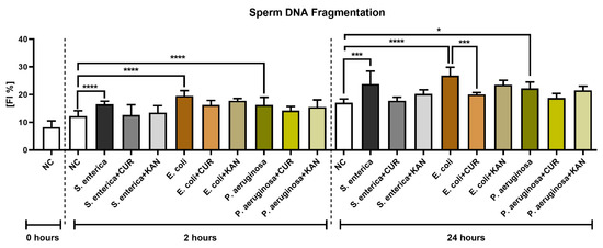 The extent of sperm DNA damage remained significantly elevated in the positive controls following 24 h of culture (p < 0.05 for P. aeruginosa; p < 0.001 for S. enterica; p < 0.0001 for E. coli). Significant sperm DNA stabilization following CUR supplementation was observed in the experimental groups exposed to S. enterica (p < 0.01) and E. coli (p < 0.001). No significant changes in sperm DNA integrity were observed in the experimental groups administered with KAN.
