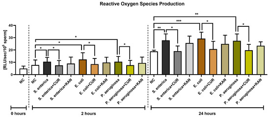The presence of S. enterica, E. coli and P. aeruginosa in the positive controls was accompanied by increased ROS generation (p < 0.05) early on in the sperm–bacteria co-culture (2 h; Figure 6). While no significant differences were recorded following KAN supplementation, a significant decline in ROS amounts was observed in all experimental groups supplemented with CUR (p < 0.05).