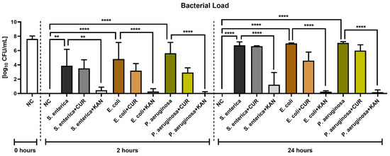 The effect of curcumin and kanamycin on bacterial load (log10 CFU/mL) during induced bacterial contamination. p < 0.01 (**), p < 0.0001 (****). NC—negative control, CUR—curcumin, KAN—kanamycin.