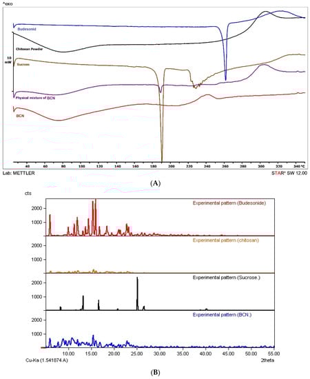 Figure 2A shows thermograms of the drug powder as well as the chitosan, sucrose, BCN and physical mixture of the excipients used in the preparation of BCN matrix. Budesonide and sucrose are crystalline compounds. Budesonide, as stated by the literature, demonstrated a sharp endothermic melting peak at around 261 °C [41], and sucrose showed an endothermic melting peak at around 190 °C [78]. In contrast, chitosan showed a broad endothermic peak at 100 °C (corresponding to the loss of water) and an exothermic peak at around 310 °C (related to the decomposition of amine units) [79]. The peak related to the melting of sucrose as well as the decomposition peak of the chitosan could be observed in the thermogram of the physical mixture, while the chitosan decomposition peak shifted towards lower temperatures in the BCN thermogram. This shift could be ascribed to the rearrangement of an intermolecular and intramolecular network of the chitosan, due to the crosslinking with the TPP ions as reported elsewhere [41] and also probable interaction between chitosan and the drug. The characteristic peaks of BU disappeared in both BCN and physical mixture thermograms probably either due to the very low content of the drug or presenting in the molecularly dispersed state [44,57].