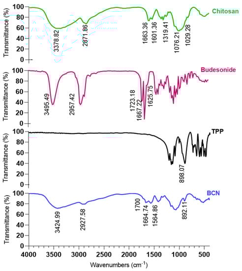 FTIR spectra of chitosan, budesonide, TPP and BCN.