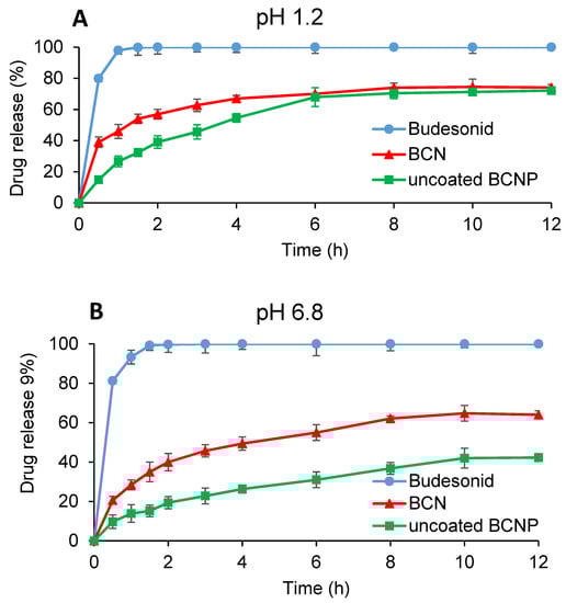 The drug release profile of budesonide, BCN and uncoated BCNP in (A) pH 1.2 and (B) pH 6.8.