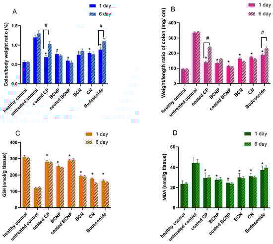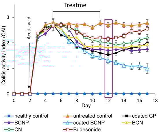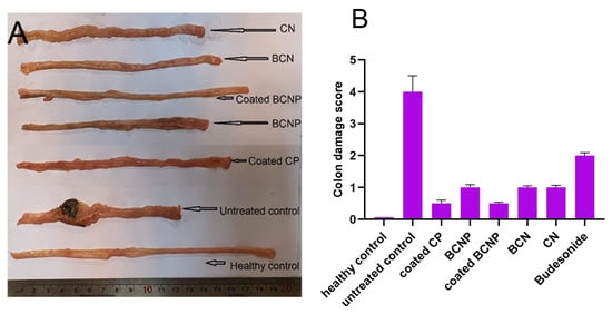 All animals employed in the study were kept in a clean room, with air-conditioned (22 ± 3 °C), controlled humidity (40 ± 5%) and light–dark cycles of 12 h; 24 h before the colitis induction, all the rats were weighed, examined to be healthy and kept fasted except for water. For induction of colitis, first of all, an intraperitoneal injection of ketamine (50 mg/kg) and xylazine (5 mg/kg) solution was used to anaesthetize rats [46,47]. Thereafter, acetic acid (2 mL 3% v/v in normal saline) was administered rectally 8 cm deep using a 2 mm diameter cannula [48]. The healthy control group received 2 mL of normal saline solution intrarectally. Rats were kept in an upside-down position for 1 min and then they were taken back to their cages. All animals were left for 3 days without treatment to let the colitis to be developed while they were free for consumption of water and food [49]. The colitis-induced rats were then divided randomly into 7 groups, with 6 animals per group. One group of rats were used as the control group (untreated group), whilst others were treated with conventional coated pellets (coated CP), pellets containing BU loaded nanoparticles (BCNP), coated BCNP, BU nanoparticle (BCN), free drug chitosan nanoparticles (CN) and free BU powder (BU) three days after induction of colitis. Each treated group received orally an equal dose of BU (0.15 mg/day) for 7 consecutive days [50]. In the case of BCN, CN and BU, the dose was suspended in 1 mL of purified water before administration. The healthy and the untreated control groups received 1 mL of normal saline. The weight and stool consistency of the rats were evaluated during this period. The rats were killed by CO2 asphyxiation either 24 h or 6 days after the last dose administration. Then, the colon, from the cecum to the anus was cut for further studies.