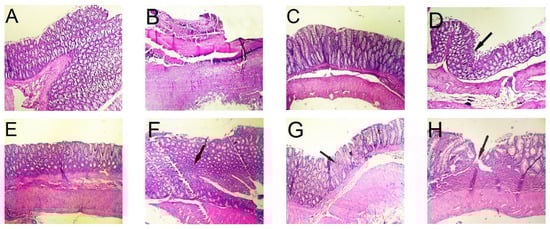 A segment of the washed colon tissue specimens was fixed in a 10% formalin solution and inserted in paraffin. Cutting sections obtained by microtome were stained with hematoxylin and eosin (H&E) and examined by optical microscope to assess the severity of colitis. The colitis severity was scored from 0 to 4 based on the microscopic observation of cross-sections of the colon. The severity of colitis was scored 0 when no or minor inflammation was observed. When there was a trace region of focal inflammatory cell infiltration, the severity of colitis was scored 1. When a major part of the colon tissue was exposed to inflammation and sign of smooth muscle thickening was observed, the severity of colitis was scored 2. If ulcerated regions and inflammatory cell infiltration were formed in the tissue sections following the inflammation, the severity of colitis was assigned a score of 3. Finally, the highest colitis severity score (i.e., 4) was assigned when the entire tissue damage appeared as necrosis and gangrene [45].