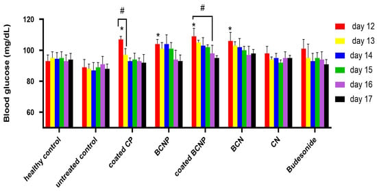 The blood glucose level in rats was measured from the 12th day until the 17th day of the study by sampling the tail vein blood with an 18-gauge needle in the strip of a blood glucose meter (Accu-chek® Active, Roche, Mannheim, Germany). This experiment could provide some comparison amongst specific colon delivery potential of different formulations investigated [57,58], and also information regarding the potency of nanoparticles for accumulation in inflamed regions. Data on blood glucose levels are stated in mg/dL and compared with untreated animals [48].