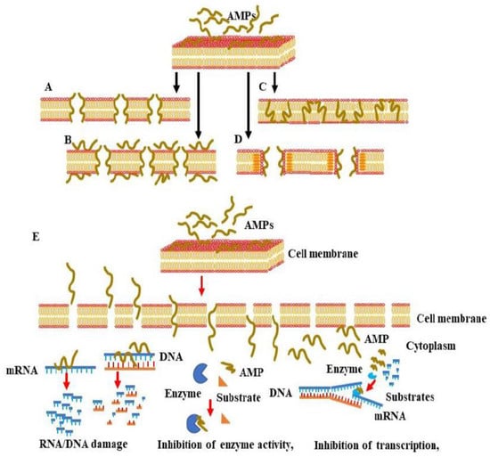 Proposed models for AMP-induced membrane permeability, membrane penetration, and interference with cellular components. AMPs exert their antimicrobial activity via interaction with negatively charged membranes to mediate and rapidly increase membrane permeability, cell membrane lysis, or the release of intracellular contents, leading to microbial cell death. There are four main models of membrane pore formation, namely, the barrel-stave model (A), toroidal pore model (B), carpet model (C) and aggregate model (D). (E) Mechanisms of the penetration of AMPs into the cytoplasm of the microbial cell and interference with intracellular components.