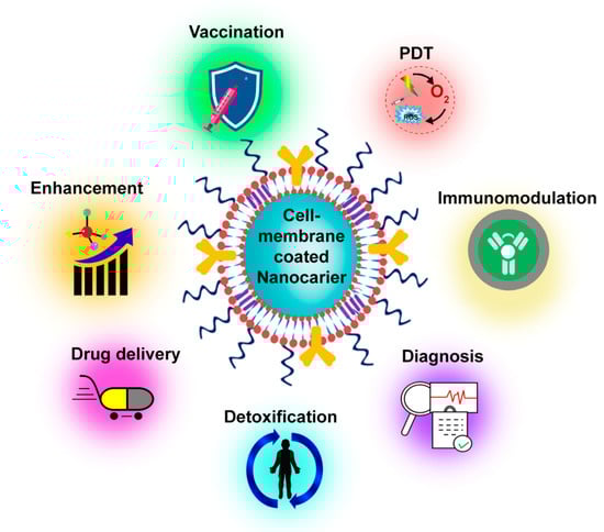 The bio-mimicking ability of the nanodecoys allows them to function inside the biological system with negligible adverse effects. Thus, they are considered the best candidate for therapeutic applications, namely, drug delivery, detoxification, vaccination, immunomodulation, photodynamic therapy, etc. (Figure 2). Owing to their multifunctional properties, they are also being used to carry diagnostic agents for bioimaging applications. Integration of diagnosis and therapeutic characteristics of nanodecoys lead to theranostic applications where a single particle could perform both activities simultaneously.