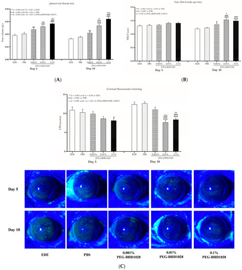 The clinical severity of the cornea was assessed using corneal fluorescein staining (CFS), a widely used procedure to detect foreign bodies and corneal surface damage. A higher CFS score indicates more severe corneal epitheliopathy. As shown in Table S1 and Figure 4C, the mean CFS score in the 0.1% (PEG)-BHD1028-treated mice group was significantly lower (p < 0.05) than in the EDE group after 5 days. After 10 days of treatment, the scores of 0.01% and 0.1% (PEG)-BHD1028-treated animals were significantly lower than that of the EDE (0.01% group: p < 0.001 and 0.1% group: p < 0.001 vs. EDE) and PBS groups (0.01% group: p < 0.001 and 0.1% group: p < 0.001 vs. PBS) and were significantly better than that of the 0.001% (PEG)-BHD1028 group (0.01% group: p < 0.001 and 0.1% group: p < 0.01 vs. 0.001% group) on Day 10.
