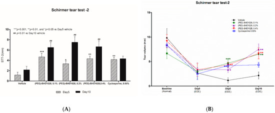 In the study with the rabbit model, a 0.1%, 0.2%, and 0.4% (PEG)-BHD1028 solutions were tested, and 0.05% cyclosporine-treated group was included as a positive reference and comparator. The tear volume, measured using Schirmer’s tear test (STT), significantly increased compared to the vehicle group in all other groups, 0.1% (p < 0.001), 0.2% (p < 0.05), and 0.4% (PEG)-BHD1028 (p < 0.01) groups and 0.05% cyclosporine-treated group (p < 0.01) on Day 5 (Table S2). After 10 days, tear production of all (PEG)-BHD1028 significantly increased compared to the vehicle (p < 0.01) (Table S2 and Figure 2A,B). However, the measured tear volume of the 0.05% cyclosporine group on Day 10 did not increase significantly from that on Day 5 or the vehicle group. A comparison between the 0.4% (PEG)-BHD1028 group and 0.05% cyclosporine animals on Day 10 is presented in a separate section along with the details of other testing parameters.