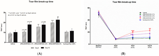 In the EDE rabbit model, the TBUT of all (PEG)-BHD1028 treated groups was significantly greater than that of the vehicle group at p < 0.01 and p < 0.001, respectively, on Day 5 (Table S2 and Figure 3A). After 10 days, the TBUT of the 0.4% (PEG)-BHD1028 group significantly increased (p < 0.01) compared with the vehicle group (Table S2 and Figure 3A). Although not statistically significant, the TBUT of the 0.1%- and 0.2%-treated groups improved relative to the vehicle group or 0.05% cyclosporine group (p < 0.058 and p < 0.065, respectively) after 10 days of treatments. The TBUT of 0.2% and 0.4% (PEG)-BHD1028 groups exhibited a continually increasing trend over time, whereas the TBUT of the vehicle or 0.05% cyclosporine group tended to stagnate (Figure 3B).