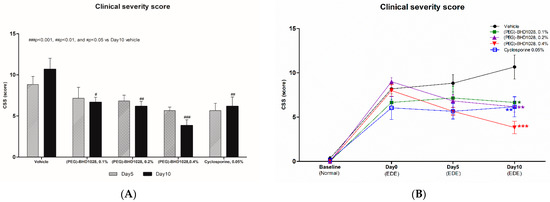 In the summary of study results, 0.2% and 0.4% (PEG)-BHD1028 substantially elevated the tear volume and TBUT relative to the vehicle and 0.05% cyclosporine groups. Especially, the 0.4% (PEG)-BHD1028-treated group exhibited significantly increased tear production (p < 0.05) and TBUT (p < 0.01) compared to cyclosporine on Day 10. Dry eye conditions are largely led by tear film instability, causing physical damage to the ocular surface and secretory glands and the subsequent infiltration of corneal/conjunctival inflammatory cells. The improvement in tear quality and quantity may indicate an improved functionality of gland epithelium tissues, such as conjunctiva, a mucosal tissue rich in goblet cells that maintain the tear stability and homeostasis of the ocular surface [32]. The conjunctival goblet cell density is correlated with clinical severity and is inversely correlated with the cytokine level of ocular surface inflammation [32,33,34]. To better elucidate the relationship between tissue functionality and the quality and quantity of tears following the (PEG)-BHD1028 treatment, tear composition and histo-physiological characterization should be further analyzed.