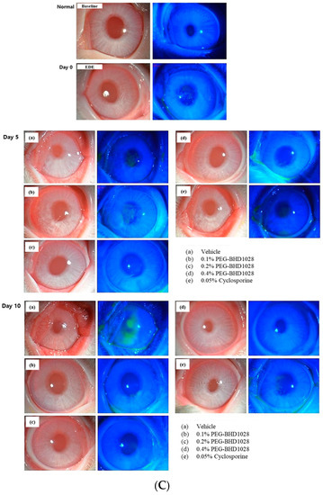 The mice were randomly assigned to five groups as follows: (1) EDE (Experimental dry eye) control mice did not receive eye drops, (2) EDE mice treated with vehicle (phosphate-buffered saline), (3) EDE mice treated with 0.001% (PEG)-HD1028, (4) EDE mice treated with 0.01% (PEG)-BHD1028, and (5) EDE mice treated with 0.1% (PEG)-BHD1028. All treatment groups received 2 μL eyedrops three times a day. The rabbit model of DED was induced with twice-daily (8 AM and 4 PM) topical administration of 0.1% BAC (benzalkonium chloride) drops (Sigma, St. Louis, MO, USA). Before BAC treatment, the control groups (baseline, naïve) underwent standard dry eye clinical tests, such as the Schirmer tear test (STT), TBUT, and corneal staining score (CSS). After BAC treatment, dry eye induction was confirmed, and the test substances were administered for 10 days while maintaining dry eye induction. The rabbits were randomly assigned to five groups as follows: (1) EDE rabbits treated with vehicle (phosphate-buffered saline), (2) EDE rabbits treated with 0.1% (PEG)-HD1028, (3) EDE rabbits treated with 0.2% (PEG)-BHD1028, (4) EDE rabbits treated with 0.4% (PEG)-BHD1028, and (5) EDE rabbits treated with 0.05% cyclosporine (Kukjepharm Co., Ltd., Seongnam, Republic of Korea). The testing materials were topically applied BID (bis in die) in both eyes.