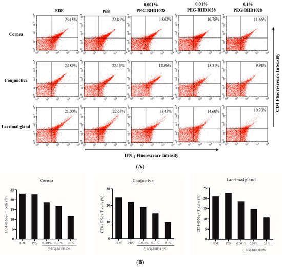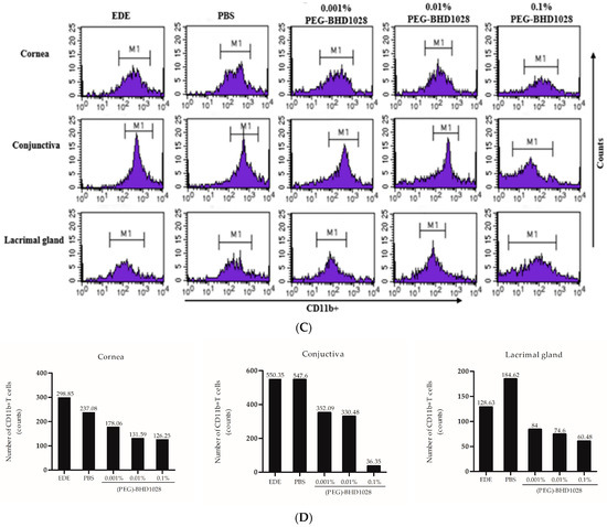The corneal barrier disruption and epithelial cell loss in DED are accompanied by myeloid and T-cell infiltration [12]. Activated T lymphocytes are the main producers of Th-1 cytokine and interferon (IFN) -γ, which promote cell apoptosis on the ocular surface [13]. To evaluate the anti-inflammatory effect of (PEG)-BHD1028 in the EDE mouse model, immune cells responsible for inflammatory cell surface markers were quantified by flow cytometry, with one animal per group. The CD4 + IFN-γ + -T-cell densities in the cornea of the EDE and vehicle groups were 23.15% and 22.83%, respectively, whereas those in the 0.001%, 0.01%, and 0.1% (PEG)-BHD1028 groups were 18.62%, 16.78%, and 11.66%, respectively. CD4 + IFN-γ + T-cell densities in the conjunctiva of the EDE and vehicle groups were 24.89% and 22.15%, respectively, and those in the 0.001%, 0.01%, and 0.1% (PEG)-BHD1028 groups were 18.96%, 15.31%, and 9.91%, respectively. In the lacrimal gland of the EDE and vehicle groups, the CD4 + IFN-γ + T-cell densities were 21.00% and 22.67%, respectively, and immune cells in the 0.001%, 0.01%, and 0.1% (PEG)-BHD1028 groups were 18.45%, 14.60%, and 10.70%, respectively. (Figure 5A,B). The geometric mean counts of CD11b+ monocytes in the cornea of the EDE and vehicle groups were 298.85 and 237.08, respectively. The counts in the 0.001%, 0.01%, and 0.1% (PEG)-BHD1028 group were 178.06, 131.59, and 126.25, respectively. In the conjunctiva, the CD11b+ monocytes in the EDE and vehicle groups were 550.33 and 547.60, respectively, whereas the counts in the 0.001%, 0.01%, and 0.1% (PEG)-BHD1028-treated groups were 352.09, 330.48, and 36.35, respectively. In addition, in the lacrimal gland, the CD11b+ monocytes in EDE and vehicle groups were 128.63 and 184.62, respectively, and the 0.001%, 0.01%, and 0.1% (PEG)-BHD1028 groups were 84, 74.60, and 60.48, respectively (Figure 5, flow cytometry and Figure 5D, histogram). The results of CD4 + IFN-γ + T cell and CD11b+ cell counts in the cornea, conjunctiva, and lacrimal gland represent the effective anti-inflammatory effect of (PEG)-BHD1028 in the mouse model.