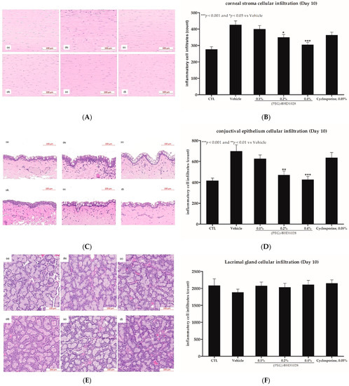 (A) Representative images of the corneal stromal immune cell infiltration. (a) Control (Normal); (b)Vehicle; (c) 0.05% Cyclosporine; (d) 0.1% (PEG)-BHD1028; (e) 0.2% (PEG)-BHD1028; and (f) 0.4% (PEG)-BHD1028. (B) Data are presented as means ± SEM (n = 6). *** p < 0.001 and * p < 0.05 vs. Vehicle. (C) Representative images of the conjunctival epithelial immune cell infiltration. (a) Control (Normal) (b) Vehicle; (c) 0.05% Cyclosporine; (d) 0.1% (PEG)-BHD1028; (e) 0.2% (PEG)-BHD1028; and (f) 0.4% (PEG)-BHD1028. (D) Data are presented as means ± SEM (n = 6). *** p < 0.001 vs. Vehicle. (E) Representative images of the lacrimal gland immune cell infiltration. (a) Control (Normal); (b) Vehicle; (c) 0.05% Cyclosporine; (d) 0.1% (PEG)-BHD1028; (e) 0.2% (PEG)-BHD1028; and (f) 0.4% (PEG)-BHD1028. (F) Data are presented as means ± SEM (n = 6).