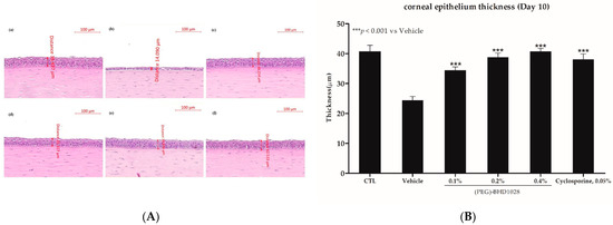 (A) Representative corneal epithelial thickness comparison between the normal and substance treatment group in the dry eye model. (a) Control (normal); (b) Vehicle; (c) 0.05% Cyclosporine; (d) 0.1% (PEG)-BHD1028; (e) 0.2% (PEG)-BHD1028; and (f) 0.4% (PEG)-BHD1028. (B) Results are presented as means ± SEM. *** p < 0.001 vs. Vehicle.