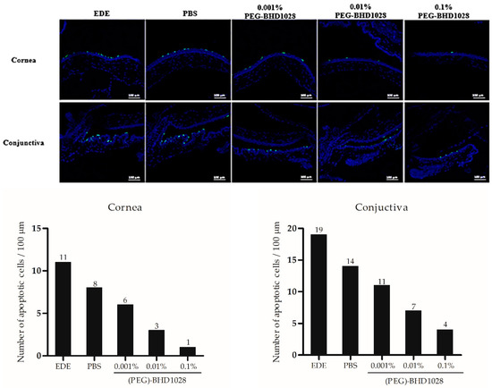 With DED progression, the epithelium in the anterior portion of the eye is pathologically modified, including functional impairment and structural changes such as secretion of abnormal tear oil and pathogenic apoptosis. Apoptotic cells in the equal area of the cornea and conjunctiva of one eye per group were quantified by the TUNEL assay. As illustrated in Figure 8, (PEG)-BHD1028 exhibited a dose-dependent anti-apoptotic effect on the mouse cornea and conjunctiva.