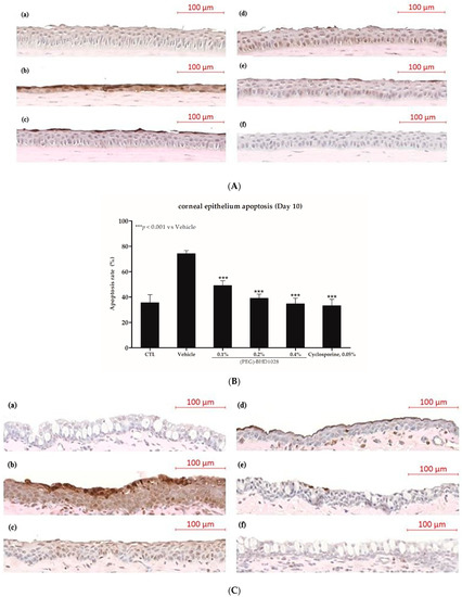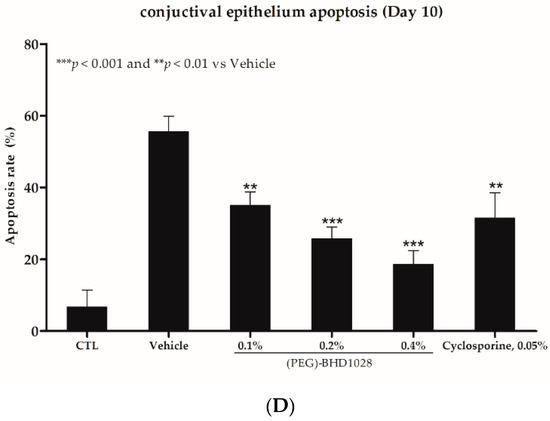 The percent ratio of apoptotic cells per unit area was evaluated in the rabbit model after 10 days. In the cornea, 35 ± 6% of apoptotic cells were detected in the normal control group and 74 ± 2% in the vehicle group. In the 0.1%, 0.2%, and 0.4% (PEG)-BHD1028-treated groups, the ratio was 40 ± 12%, 39 ± 3%, and 35 ± 4%, respectively. The percent ratio in the cyclosporine 0.05% group was 33 ± 5%. The apoptotic cells in the cornea of all (PEG)-BHD1028 and 0.05% cyclosporine groups were significantly lower than in the vehicle group at p < 0.001 (Figure 9A,B). Furthermore, the cell apoptosis percent ratio in the conjunctiva was 7 ± 5% in the normal control group and 56 ± 4% in the vehicle group. In the 0.1%, 0.2%, and 0.4% (PEG)-BHD1028-treated group, the percent ratio was 35 ± 4%, 26 ± 3%, and 19 ± 4% on Day 10. The apoptotic cell percent ratio of the cyclosporine 0.05% group was 32 ± 7% (Figure 9C,D). All tested (PEG)-BHD1028 concentrations and 0.05% cyclosporine significantly reduced corneal and conjunctival apoptosis compared to the vehicle group after 10 days of treatment.