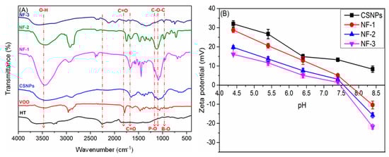 (A) FTIR spectra of the native VOO, HT, CSNPs, PBA-CSNPs (NF-1), PBA-CSNPs-VOO (NF-2), and PBA-CSNPs-HT (NF-3). (B) Effect of pH on the value of ZP of CSNPs, NF-1, NF-2, and NF-3.