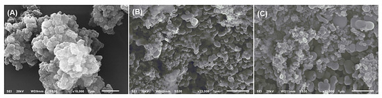 SEM images of different NFs: (A) PBA-CSNPs (NF-1), (B) PBA-CSNPs-VOO (NF-2), (C) PBA-CSNPs-HT (NF-3).
