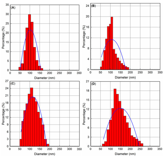 PSD histograms of NFs obtained using different PBA-CSNPs: (A) CSNPs, (B) PBA-CSNPs, (C) PBA-CSNPs-VOO, and (D) PBA-CSNPs-HT.