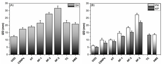 Graph for the inhibition zone diameter (IZD, mm) for the examined NFs against (A) Gram-positive bacteria and (B) Gram-negative bacteria.
