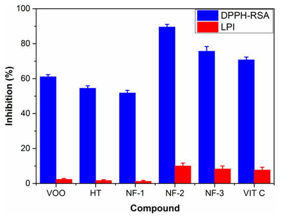 Figure 6 shows the results of the DPPH-RSA and LPI tests, which evaluate the antioxidant capacity of the nanoencapsulated VOO and HT which were studied in comparison to the bare VOO and HT. The standard antioxidant (Vitamin C, VIT C) was used as a positive control. The findings demonstrated that the DPPH-RSA of VOO-loaded PBA-CSNPs nanocapsules (NF-2) (87.53%) was significantly (p ≤ 0.05) higher than both the native nanocapsules (NF-1) (51.78%), the free VOO (61.07%), and VIT C (70.78%). Meanwhile, the anti-radical activity of the HT (DPPH-RSA 54.47%) was significantly (p ≤ 0.05) increased after nanoencapsulation by PBA-CSNPs to form NF-3 (DPPH-RSA 75.67%). Overall, our findings support the necessity and significance of the PBA-CSNPs nanocapsules for the delivery of VOO and HT and the achievement of significant antioxidant action at extremely low concentrations.