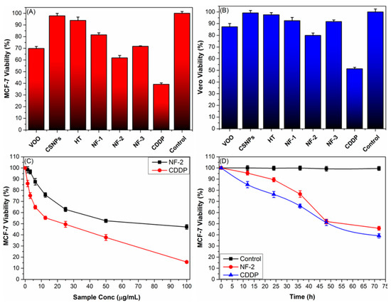 Inhibitory effects of a single dose (25 μg/mL) of PBA-CSNPs-NFs on the proliferative activities of (A) MCF-7 cells and (B) Vero cells. (C) Dose-dependence cytotoxicity performance of the most active anticancer agent (NF-2) against MCF-7, as compared to the clinical anticancer drug (CDDP). (D) Time-dependence cytotoxicity performance of IC50 dosages of NF-2 and CDDP on MCF-7 cells.