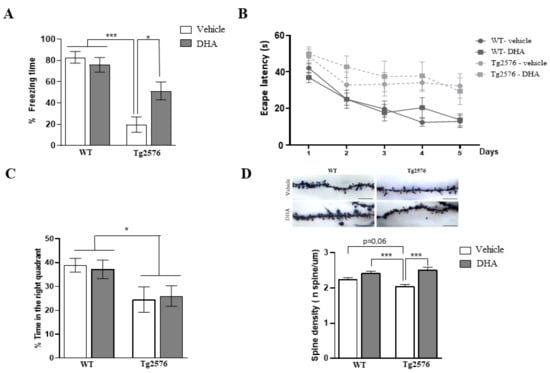 Wild-type (WT) and Tg2576 mice received daily DHA or vehicle and were analyzed 5 weeks later using fear conditioning and the Morris water maze (MWM). (A) Freezing behavior from WT and Tg2576 mice treated with DHA or vehicle. Data represent the percentage of freezing time during the test. (B) Escape latency of the hidden platform in the MWM test for the WT and Tg2576 mice treated with DHA or vehicle (C) Percentage of time spent in correct quadrant during the probe test at day 6. (D) Dendritic spine density in CA1 hippocampal neurons from WT and Tg2576 mice treated with DHA or vehicle. In all figures, results are expressed as mean ± SEM (n = 8–11 per group). Two-way analysis of variance (ANOVA) and Tukey’s post hoc test were used for statistical analyses, * p ≤ 0.05, *** p ≤ 0.001.