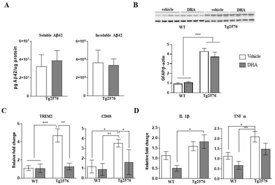 Amyloid pathology and neuroinflammatory markers in the brains of WT and Tg2576 mice chronically treated with DHA. (A) Levels of soluble and insoluble human Aβ, as quantified by ELISA in Tg2576 mice treated with DHA or vehicle. (B) Western blots showing the effects of DHA or vehicle treatment in WT and Tg2576 mice on GFAP expression, normalized to actin, in 2% SDS hippocampal extracts. (C,D) The mRNA expression level of microglia markers (TREM2 and CD68) and proinflammatory markers (IL1β and TNFα) were assessed by qRT-PCR. In all figures, results are expressed as mean ± SEM (n = 4–8 per group). Two-way analysis of variance (ANOVA) and Tukey’s post hoc test were used for statistical analyses, * p ≤ 0.05, ** p ≤ 0.01, *** p ≤ 0.001.
