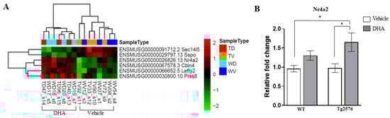 Common genes differentially expressed between vehicle and DHA treatment in both wild-type and Tg2576 mice. (A) Differentially expressed genes clusters upon DHA (D) treatment in wild-type (W) and Tg2576 (T) mice. (B) The mRNA expression level of Nr4a2 was assessed by qRT-PCR. Results are expressed as mean ± SEM (n = 4–8 per group). Two-way analysis of variance (ANOVA) and Tukey’s post hoc test was used for statistical analyses, * p ≤ 0.05.