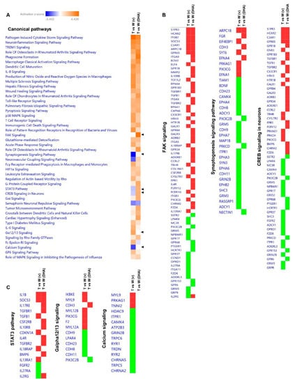 Subsequently, based on transcriptomic datasets, we performed a systems biology analysis using Ingenuity Pathway Analysis (IPA) software to identify differentially regulated canonical pathways between vehicle-treated mice (Tg2576 vs. WT) and DHA-treated mice (Tg2576 vs. WT) (Figure 4A). Interestingly, the synaptogenesis signaling pathway, CREB signaling in neurons and calcium signaling pathways were among the inhibited pathways in the Tg2576 vs. WT (vehicle) mice, and they were partially rescued upon DHA treatment (Figure 4A,B). The focal adhesion kinase (FAK) signaling pathway, which has been described as regulating neuronal growth, synaptic plasticity and hippocampus-dependent learning and memory [], was one of the signaling routes that tended to be activated upon DHA treatment (Figure 4A,B). Likewise, STAT3 and G alpha 12/13 signaling pathways, which have been reported to be involved in synaptic plasticity [], and in neuronal migration, axonal guidance and neurotransmitter release [], respectively, were also among the significant predictive inhibited pathways in the Tg2576 mice compared to WT mice (untreated), and they became activated upon DHA treatment (Figure 4A,C). Changes in the morphology and density of dendritic spines are believed to be crucial for maintaining synaptic function and plasticity. Thus, these predictions, based on differential transcriptomic fingerprints, together with behavioral data and with the dendritic spine density analysis (Figure 1), indicate that DHA treatment is able to partially ameliorate fear memory deficits of Tg2576 mice through the reactivation of these pathways. Nonetheless, in WT animals with a preserved memory function, no enhancement of memory or significant increase in spine density was appreciated.