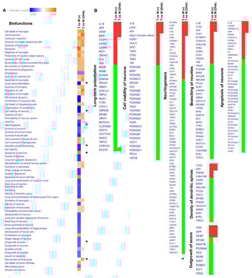 Predictive activation profile of pathways upon DHA treatment. Based on transcriptomic datasets, systems biology analyses were performed using IPA software to obtain the activation prediction of significantly altered pathways (A). The activation z-score was calculated as previously described with IPA. Blue and orange squares indicate inhibition and activation directionality, respectively. Black triangles refer to specific processes with an activation score associated with DHA treatment (B,C). T: Tg2576, W: wildtype, v: vehicle. Red: up-regulation; green: down-regulation.