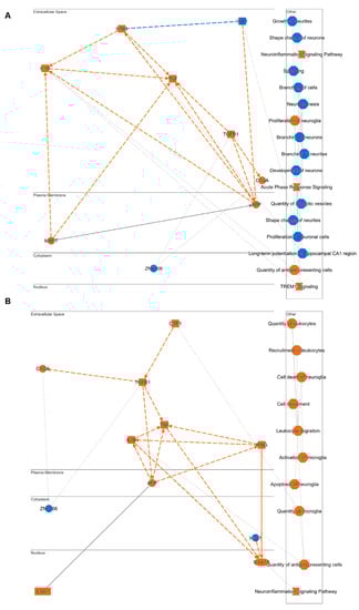 The mechanistic hypothesis generated also indicated that the beneficial effect of DHA may also be mediated by its action through inflammatory markers. Specifically, it showed that the activation of TREM signalling in Tg vs. WT mice (Figure 6A) was alleviated with DHA (Figure 6B), while the activation of neuroinflammatory markers such as ILβ and TNFα (Figure 6A) was not observed upon DHA treatment (Figure 6B). It should be noted that these results correlate with the analysis of RT-qPCR neuroinflammatory markers (Figure 2), thus supporting the proposed mechanistic hypothesis.