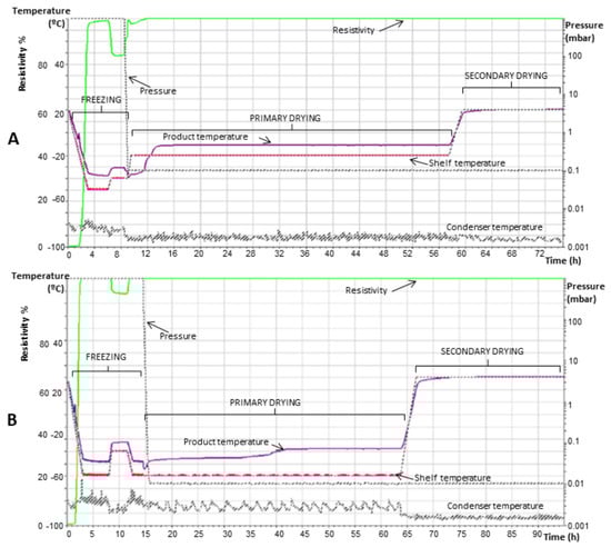 - Bjelošević, M.; Seljak, K.B.; Trstenjak, U.; Logar, M.; Brus, B.; Ahlin Grabnar, P. Aggressive Conditions during Primary Drying as a Contemporary Approach to Optimise Freeze-Drying Cycles of Biopharmaceuticals. Eur. J. Pharm. Sci. 2018, 122, 292–302. [Google Scholar] [CrossRef]