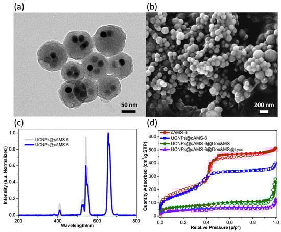 (a) TEM and (b) SEM image of the UCNPs@cAMS-6; (c) upconversion luminescence of the UCNPs@sAMS-6 and UCNPs@cAMS-6 with an excitation at 980 nm laser (2 W cm−2); and (d) N2 adsorption and desorption of cAMS-6, UCNPs@cAMS-6, UCNPs@cAMS-6@Dox&MS, and UCNPs@cAMS-6@Dox&MS@Lyso.