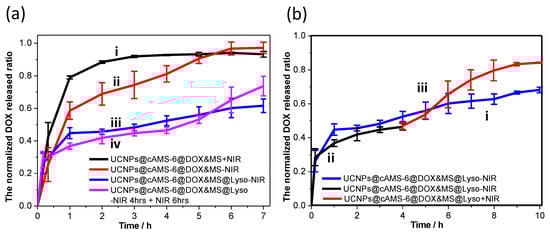 (a) Drug-release profile of DOX from UCNPs@cAMS-6@DOX&MS with (i) NIR light or (ii) without NIR light or from UCNPs@cAMS-6@DOX&MS@Lyso nanoparticles (iii) without NIR light or (iv) without NIR light for the first 4 h, following which the NIR light was switched on for the remaining 3 h; (b) drug-release profile of DOX from the UCNPs@cAMS-6@DOX&MS@Lyso nanoparticles over 10 h (i) without NIR light or (ii) without NIR light for the first 4 h, followed by (iii) NIR light exposure for the remaining 6 h.