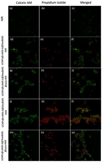 Laser scanning confocal microscopy images showing viability of MCF-7 cells after DOX release from newly developed DRS. DOX release was induced under near-infrared irradiation (NIR-I) using 980 nm lasers. Representative images of cells exposed to the DRS: (a–c) without the incorporated drug (DOX) under NIR-I, (d–f) containing the UCNPs@cAMS-6@DOX&MS or (g–i) UCNPs@cAMS-6@DOX&MS@Lyso, nanoparticles without NIR-I or (j–l) containing UCNPs @cAMS-6@DOX&MS, or (m–o) UCNPs@cAMS-6@DOX&MS @Lyso, under NIR-I. All images were taken under 10× objective lens.