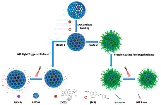 Current NIR light-induced photochemistry- and/or phototherapy-based technologies for DRSs development largely rely upon upconversion nanoparticles (UCNPs) [20,21], which serve as nanotransducers, absorbing single-band NIR light and subsequently emitting high-energy UV-to-visible light. UCNPs possess unique photonic properties, including distinct NIR light excitation, sharp emission peaks, high photostability, low cytotoxicity, low photodamage, and zero-autofluorescence, deeming them the unique candidate for the NIR light-responsive DRSs [22,23,24,25]. Qu et al. anchored photochromic spiropyran on the mesoporous silica-coated UCNPs as an NIR-controlled DRS and achieved greatly enhanced therapeutic efficiency [26]. Yang et al. demonstrated a good release profile of an anti-cancer drug, doxorubicin (DOX), from mesoporous silica-coated Ln-UCNPs; upon irradiation, the DOX can be released from the light-opened capsule [27]. Although the UCNPs-based DRSs have been widely explored [24,25], the dual-function DRSs that can both trigger and slow down drug release within one single nano-system are still rare. Paula et al. reported protein binding on the surface of MSNs, which blocks mesopores and then delays the drug release at low drug loadings (3 wt%) in vitro [28]. In contrast to other proteins used in formulation science (e.g., albumin), lysozyme, with a high isoelectric point (pI) of 10.7, and a net positively charged protein at physiological pH (7.4), can strongly bind to the negatively charged MSNs surface via electrostatic interaction and further prolong the drug-release rate [29].