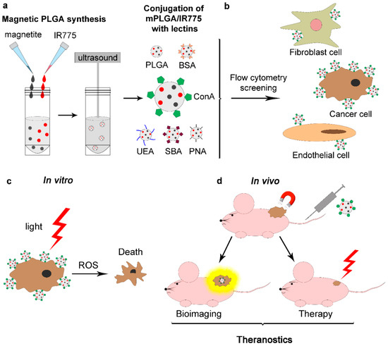 Lectin-conjugated magnetic PLGA for photodynamic therapy: scheme of the experiment. (a) Magnetite and photosensitizer IR775-loaded PLGA nanoparticles were synthesized via the “oil-water” microemulsion method. (b) As-synthesized mPLGA/IR775 nanoparticles were conjugated with different lectins and screened with flow cytometry for the most effective binding to cancer cells. (c) In vitro cell toxicity studies: cancer cells labeled with mPLGA/IR775-ConA were irradiated with an external IR light leading to cancer cell death. (d) In vivo diagnostics and therapy study: magnet-assisted delivery of mPLGA/IR775-ConA allowed for effective visualization and elimination of the tumor, thus realizing the theranostics concept.