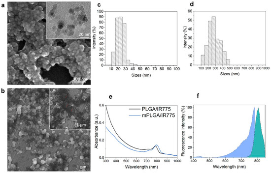 Synthesis and characterization of mPLGA/IR775 nanoparticles. (a) Scanning electron microscopy of magnetite synthesized with the coprecipitation technique. The inset is transmitting electron microscopy of magnetite. (b) Scanning electron microscopy of PLGA nanoparticle loaded with magnetite and IR775 photosensitizer. The SEM inset demonstrates the incorporation of magnetite: red arrows show white dots corresponding to magnetite cores. (c) Physical size distribution of magnetite obtained via SEM image processing. (d) Physical size distribution of PLGA nanoparticles loaded with magnetite and IR775 (mPLGA/IR775). (e) UV–VIS absorbance spectrum of mPLGA/IR775 and PLGA/IR775 nanoparticles. (f) Excitation and emission fluorescence spectra of mPLGA/IR775 nanoparticles: blue—fluorescence excitation (measured with λem = 800 nm), fluorescence emission (measured with λex = 700 nm).